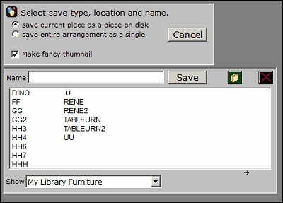 To make your own furniture, you first use the Design Editor to create the piece, then once it looks good, you click File then Save as Piece to bring up a the save menu: